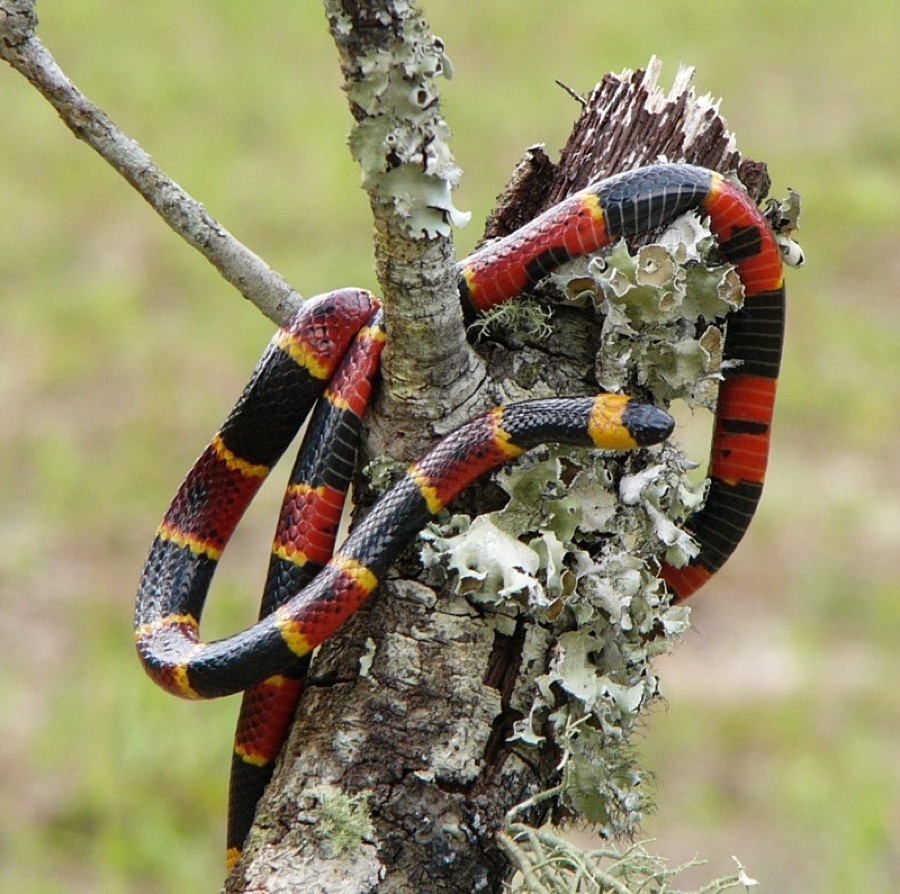 Similar species: The Scarlet Kingsnake and the Scarlet Snake. Please note the two warning colors, RED and YELLOW, touch each other and the nose is black on the Eastern Coral Snake.