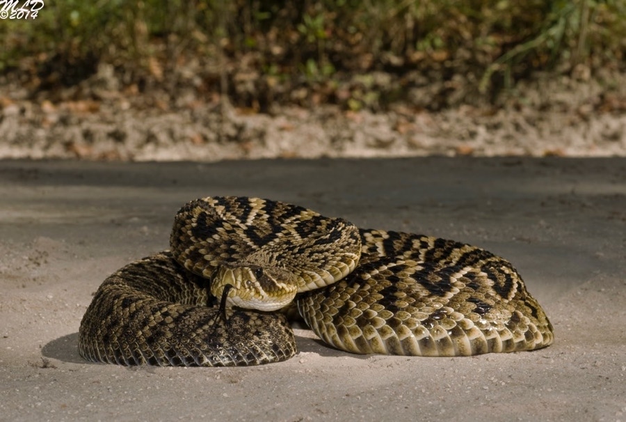 This is a large and potentially dangerous rattlesnake that can strike up to 2/3 of its body length. If you encounter one, stay a healthy distance from it and move on.